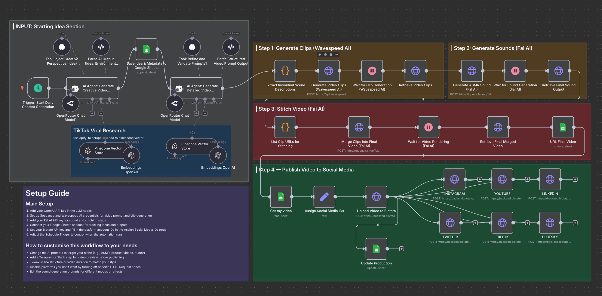 A daily content pipeline that generates ideas, creates video clips, adds sounds, and auto-publishes across TikTok and other platforms—fully hands-free.