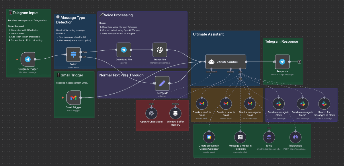Centralizes voice, text, and email inputs, processes them through AI, and automates responses across Gmail, Slack, and Telegram—your all-in-one productivity agent.